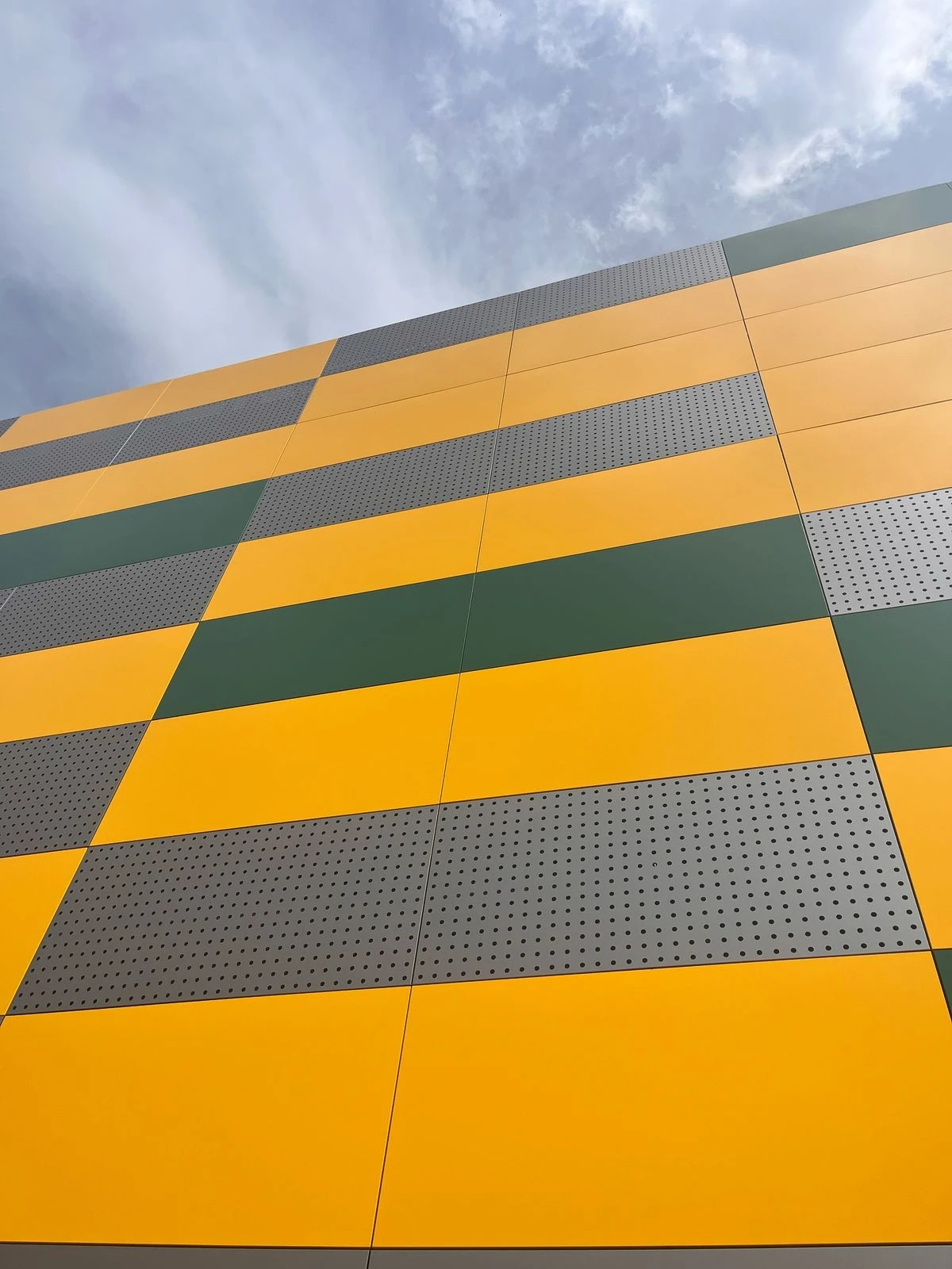 Outro elemento chave é o painel perfurado, que proporciona permeabilidade visual durante o dia. À noite, a retroiluminação dos furos intensifica a sensação de movimento, complementando a combinação de cores e a paginação dinâmica.