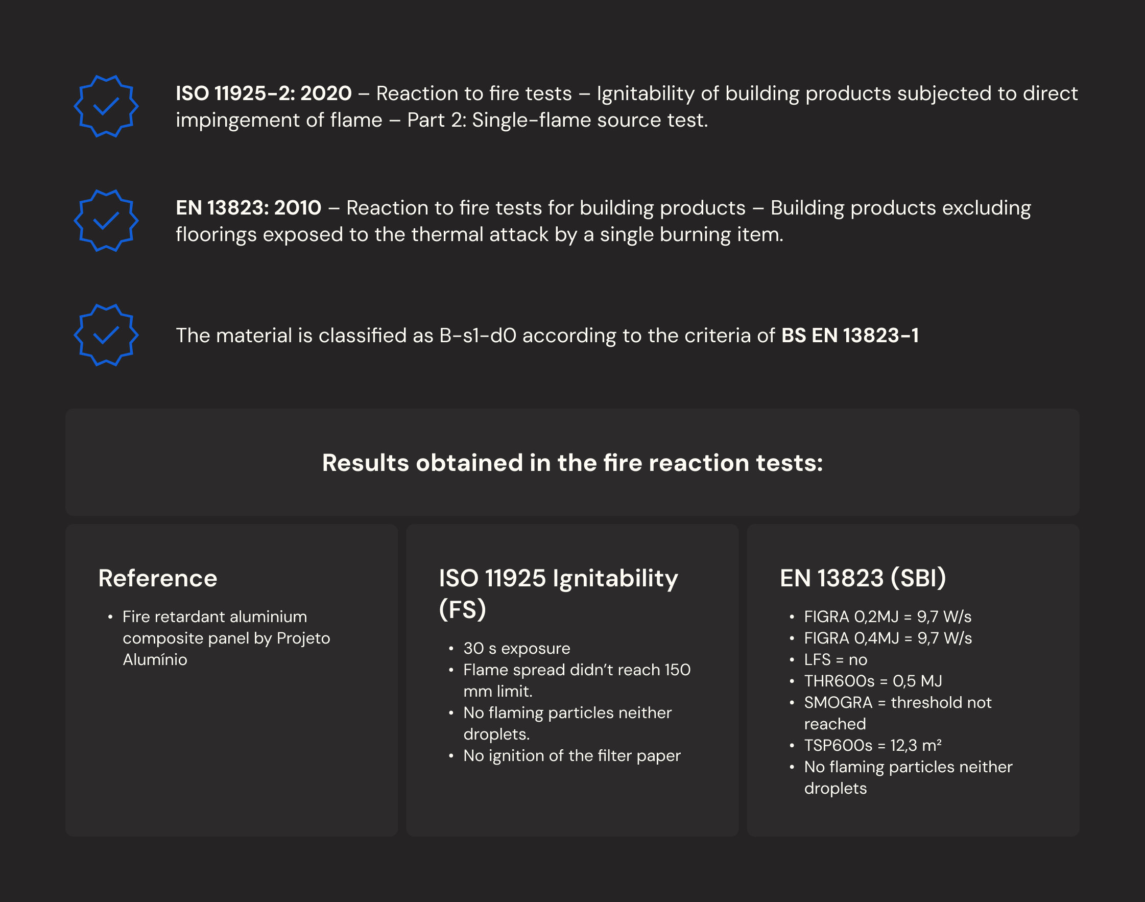 Its composition includes pre-painted aluminum and a modified mineral core (FR – Fire Retardant).