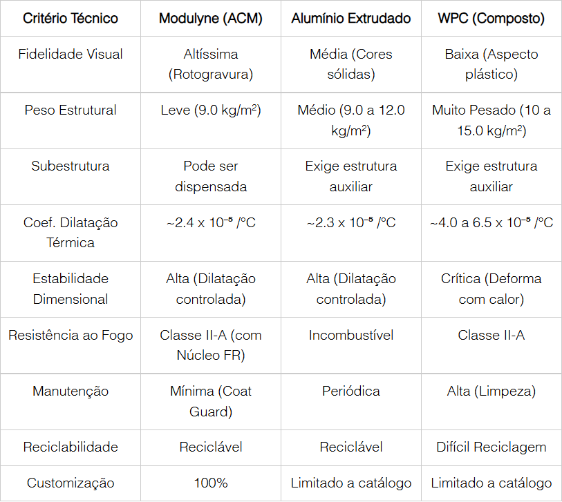 A estabilidade dimensional é o maior desafio de uma fachada. O WPC, por exemplo, possui um coeficiente de dilatação quase 3 vezes superior ao do alumínio, o que causa o efeito de “encanoamento” e empenamento das réguas após ciclos de calor.