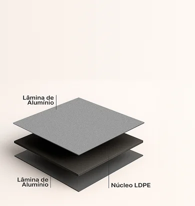 Sua composição inclui alumínio pré-pintado e núcleo termoplástico (LDPE).